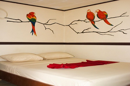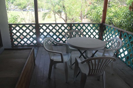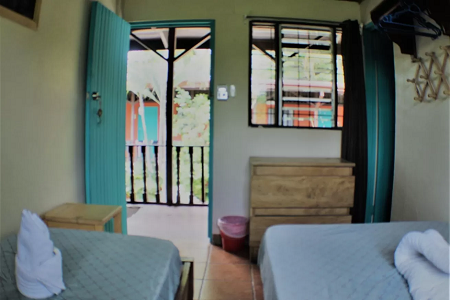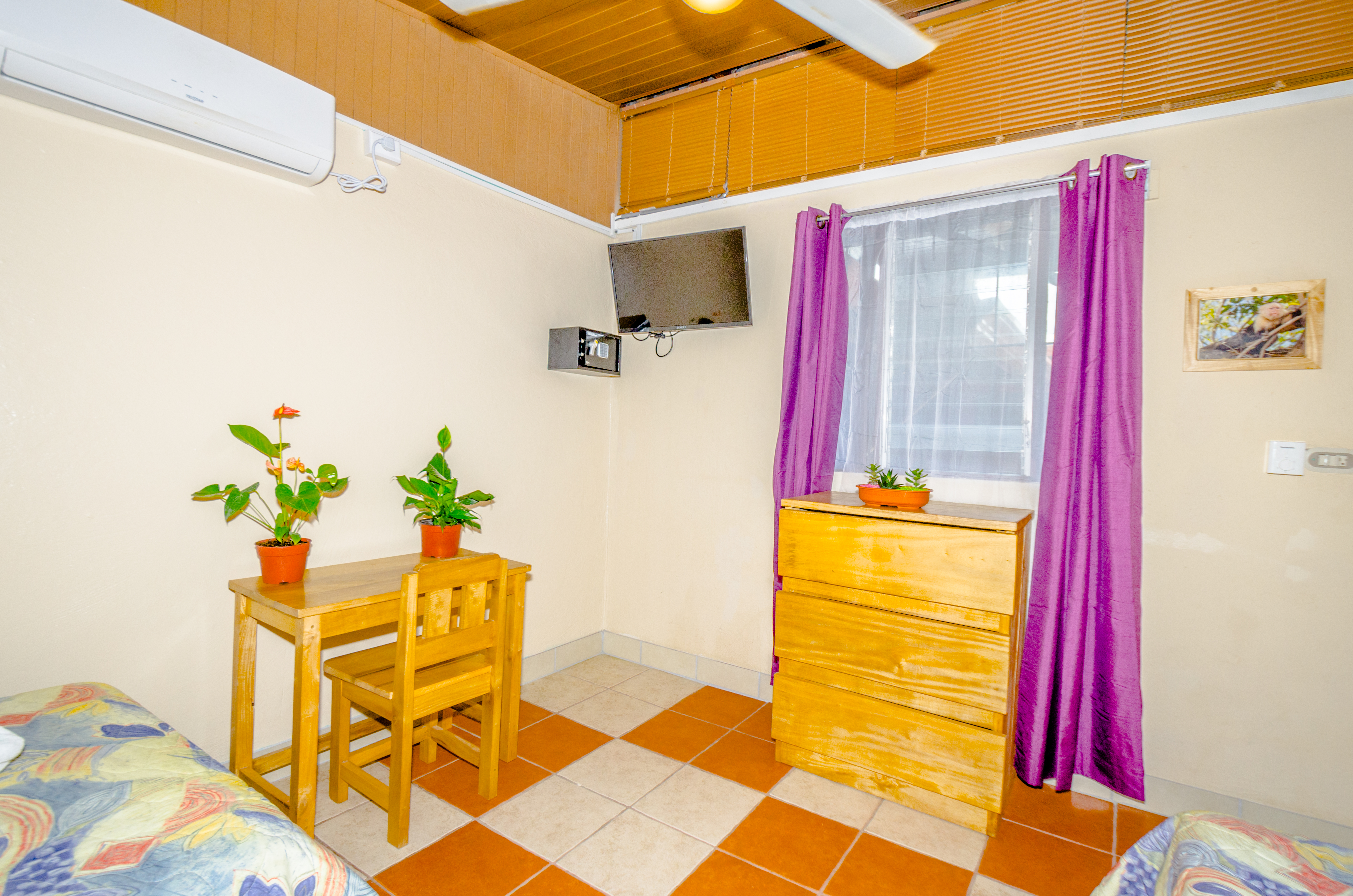 Our second-floor apartment is equipped with two bedrooms, AC, a balcony, a kitchen and private bathroom.